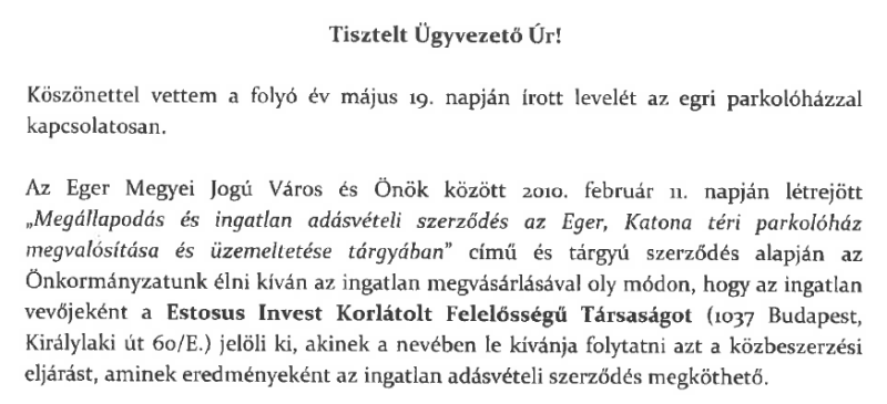 2020. májusában a polgármester közgyűlési felhatalmazás nélkül az Estosus Kft.-t (ami csak két hónappal korábban alakult) jelölte ki a parkolóház megvételére az Önkormányzat helyett, amit a bizottság aggályosnak talált, főleg azért, mert pályázat nem került lefolytatásra, nem ismert, hogy milyen alapon került a cég kiválasztásra. A cég kijelölésére a bizottság rendelkezésére álló adatok alapján ellenérték nélkül került sor. Miközben a polgármester tudomása szerint a parkolóház becsült piaci értéke 780 millió forint körül volt, ingyenesen került átadásra a vételi jog, mint vagyoni értékű jog gyakorlásának lehetősége egy kft-nek, szerződés nélkül, egy egyoldalú polgármesteri nyilatkozattal. Sem a polgármester, sem Spisák György nem adott magyarázatot arra sem, hogy pontosan mi lett a vételi jog gyakorlásának és a kijelölésnek a sorsa, hogyan akadt el a folyamat.