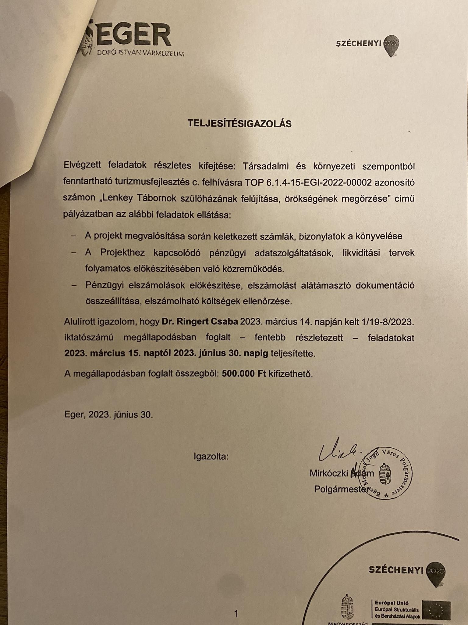 Majd egy olyan szerződést és részleges teljesítésről szóló igazolást mutatott be, amin egyértelműen látszik, hogy Ringert Csaba, a Vármúzeum igazgatója Mirkóczki Ádám megbízótól 1,5 millió forintot kap megbízás keretén belül „a projekt céljának megvalósításában, illetve szakmai felügyeletében közvetlen közreműködés, a projektben résztvevők átfogó koordinálása, munkájuk irányítás” elvégzésére. Domán szerint ez pontosan egy várigazgató munkája. Kérdést is intézett a polgármesternek: