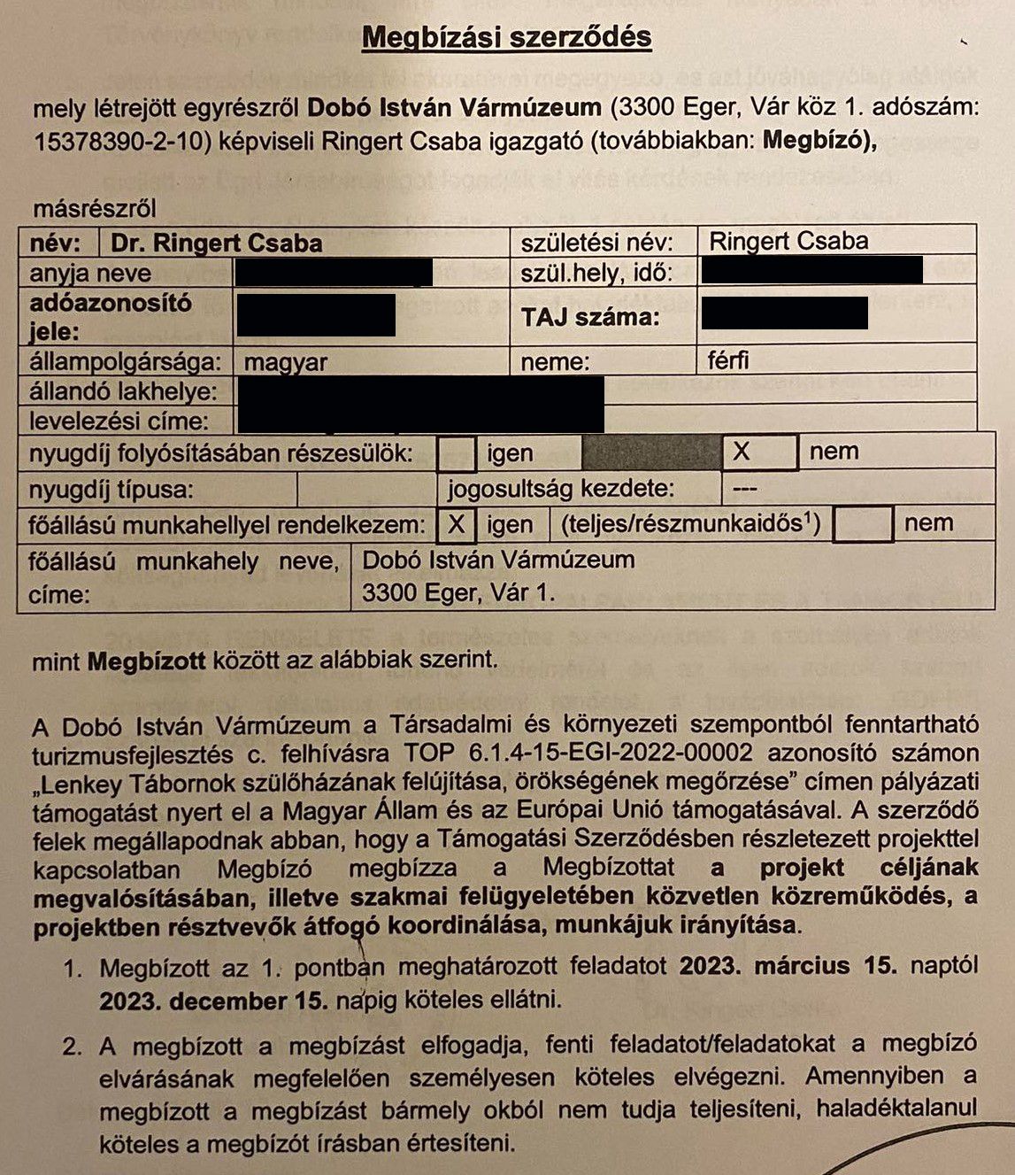 A szerződés érdekes záró része pedig egyenesen arról szól, hogy nincs olyan közalkalmazott a vármúzeumban, aki meg tudná oldani a projekt levezetését.