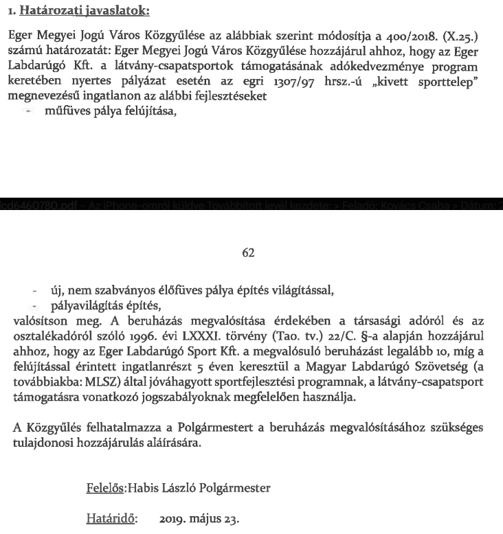A határozati javaslat szövege szerint a Szentmarjay Tibor Városi Stadion vonatkozásában évi nettó 8.000.000.- Ft üzemeltetési díj, az Északi Sporttelep vonatkozásában évi 18.000.000.- Ft üzemeltetési díjat kell megfizetnie az Önkormányzatnak úgy, hogy gondoskodni kell az értékállandóságáról is az inflációkövetés figyelembevételével. Az érdekesség így az, hogy az eddig áttételesen önkormányzati kiadás megmarad önkormányzati kiadásnak, csak átalakul oly módon, hogy a NER-közeli Egri Sportcentrum Labdarúgó Sportegyesület kapja meg, mint üzemeltetési díj!