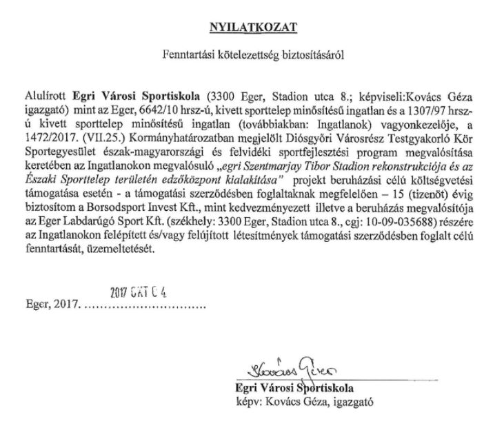 További jelentős probléma lehet a kérdésben az a nyilatkozat a sportiskola részéről valamint két közgyűlési határozat arról, hogy az Északi Sporttelep használatát 15 évre megkapja a Sport Kft., illetve 10 illetve 5 évre biztosították az Eger Labdarúgó Sport Kft. részére a használatot.