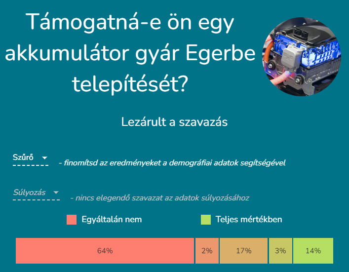 A válaszok egyértelműek és döntőek voltak, 64 %-a szerint ide nem kell akkumulátorgyár. Mindösszes 14%-nyi szavazat áll egy esetleges megvalósítás mellett.