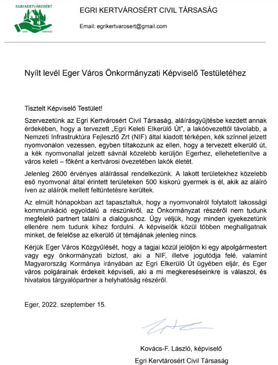 Az Egri Kertvárosért Civil Társaság nyílt levelét itt is olvashatják.