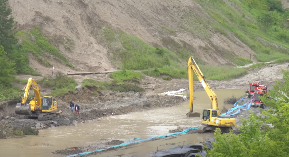 Drónfelvételeken is látható, hogy a megáradt patak méreteihez képest eltörpülnek a szivattyúk és munkagépek. A helyi önkéntesek által épített gát már kedd reggelre összeomlott.