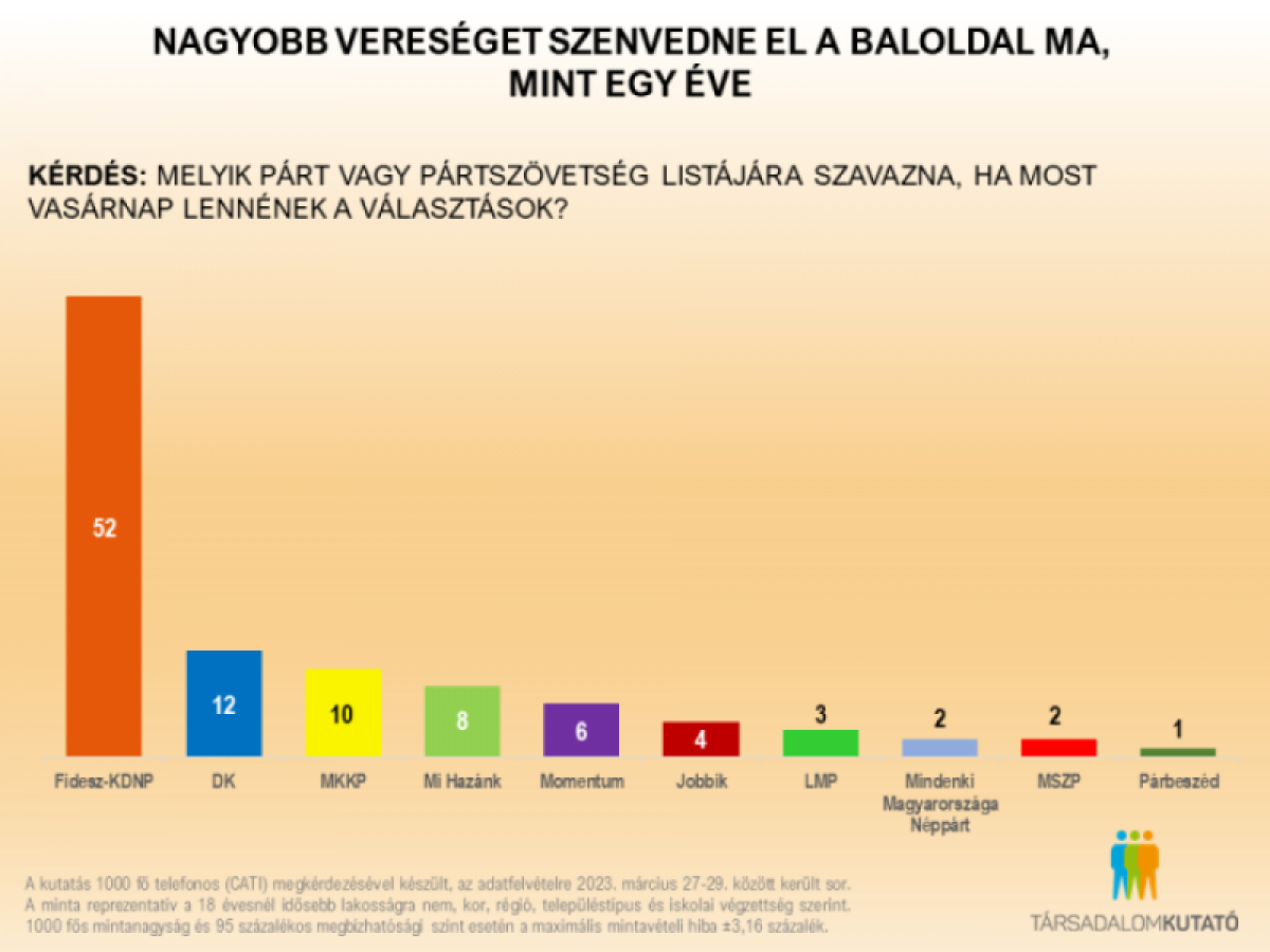 A március 27. és 29. között, ezer ember telefonos megkérdezésével készült felmérés szerint a kormánypártok egy évvel a választások után is minden második választót a táborukban tudhatnak, s képesek lennének megismételni a 2022-es országgyűlési választáson elért győzelmüket.