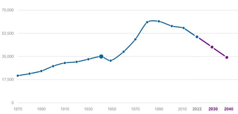 Eger lakosságszáma (ezer fő) 1870-től napjainkig és azon túl is becsülve (forrás)